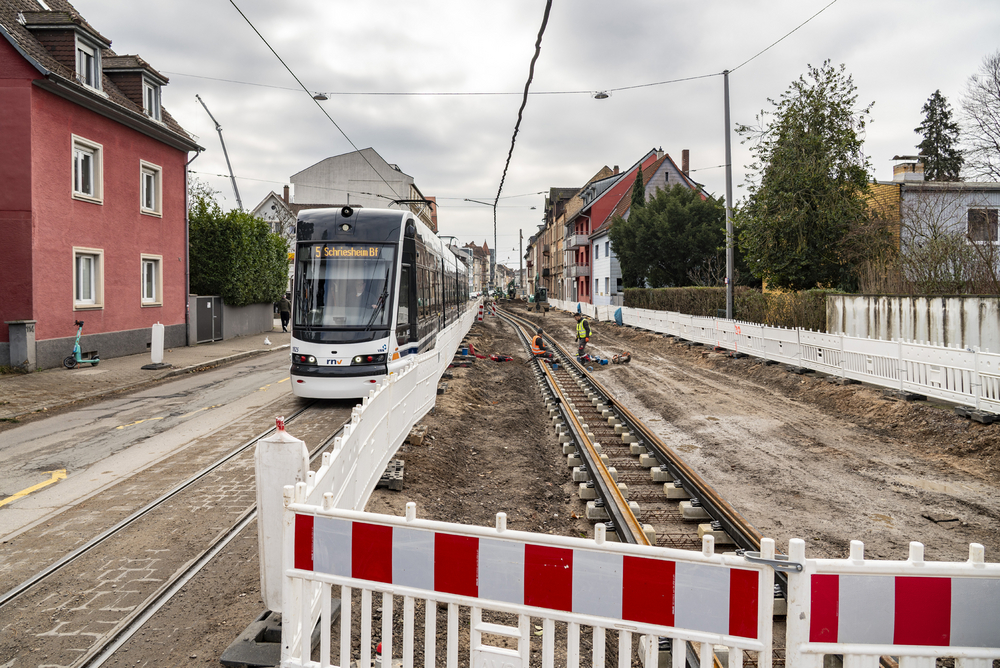 Blick in Richtung Süden in die Dossenheimer Landstraße, in der aktuell neue Gleise gebaut werden. Bahnbetrieb und der Autoverkehr in Richtung Norden laufen unbeeinträchtigt weiter.